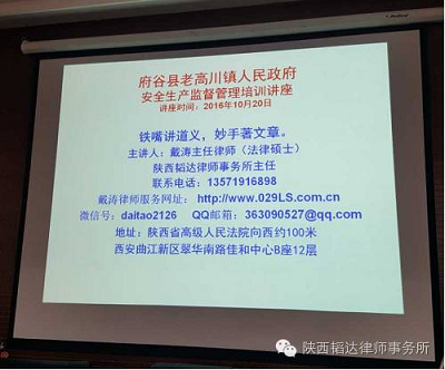 2016年10月20日,陕西韬达律师事务所戴涛主任律师应邀到常年法律顾问单位府谷县老高川镇人民政府详细讲解了史上最严厉的《安全生产法》,全镇党政干部、镇属各企业的主要负责人、各村委会党支部书记和村委会主任以及安全生产管理人员参加了培训学习。