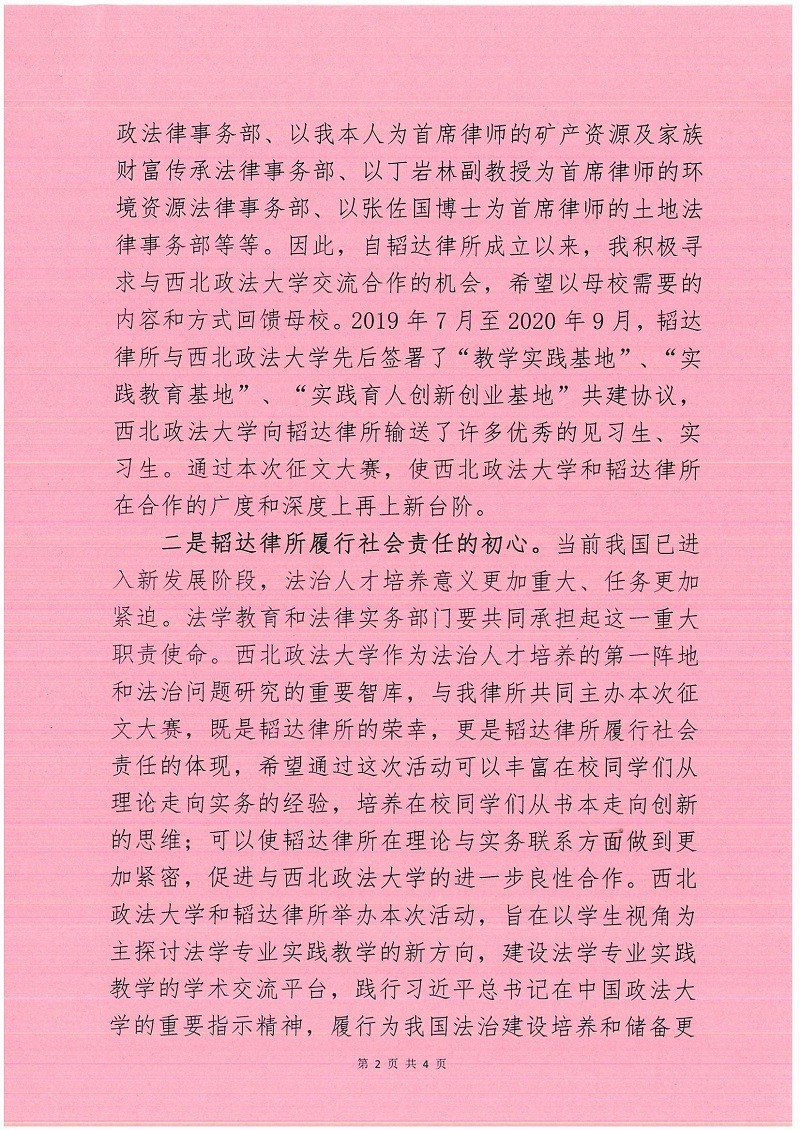 二是韬达律所履行社会责任的初心。当前我国已进入新发展阶段,法治人才培养意义更加重大、任务更加紧迫。法学教育和法律实务部门要共同承担起这一重大职责使命。西北政法大学作为法治人才培养的第一阵地和法治问题研究的重要智库,与我律所共同主办本次征文大赛,既是韬达律所的荣幸,更是韬达律所履行社会责任的体现,希望通过这次活动可以丰富在校同学们从理论走向实务的经验,培养在校同学们从书本走向创新的思维;可以使韬达律所在理论与实务联系方面做到更加紧密,促进与西北政法大学的进一步良性合作。西北政法大学和韬达律所举办本次活动,旨在以学生视角为主探讨法学专业实践教学的新方向,建设法学专业实践教学的学术交流平台,践行习近平总书记在中国政法大学的重要指示精神,履行为我国法治建设培养和储备更多优秀人才的社会责任。