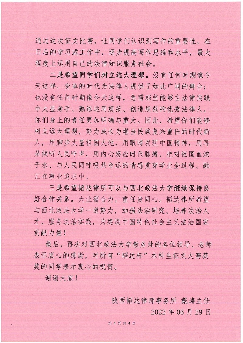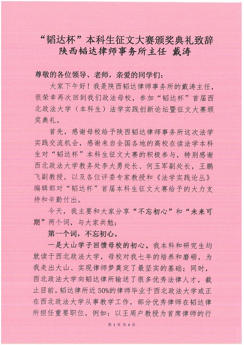大家下午好!我是陕西韬达律师事务所的戴涛主任,很荣幸再次回到我们政法母校,参加“韬达杯”首届西北政法大学(本科生)法学实践创新论坛暨征文大赛颁奖典礼。