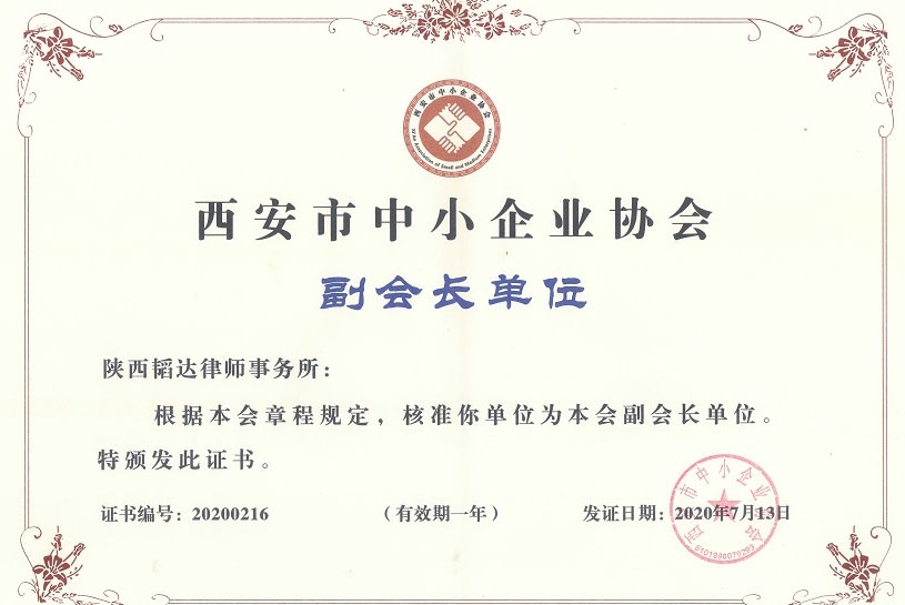 - 西安市中小企业副会长单位证书