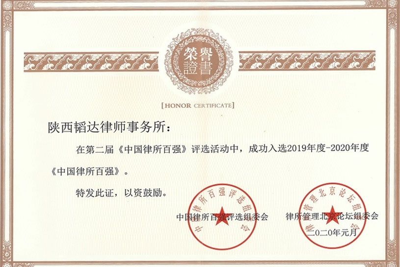 2019年入选2019年度-2020年度《中国律所百强》